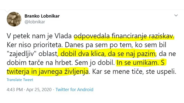 Branko Lobnikar, profesor na Fakulteti za varnostne vede in nekdanji vidni politik stranke Zares (pri Gregorju Golobiču je bil podpredsednik stranke, predsednik celjskega odbora Zaresa, kandidat za celjskega župana, kandidat za poslanca in državni sekretar med Pahorjevo vlado), po propadu Zaresa ter koncu politične kariere pa se je predstavljal za neodvisnega strokovnjaka, se je nenadoma umaknil s twitterja in iz javnega življenja. In to samo zato, ker mu je vlada odpovedala financiranje raziskav in zaradi dveh - domnevnih in skrivnostnih - telefonskih klicev?! Ker seveda ni prvič, da je vlada nekomu odpovedala raziskave, je ta Lobnikarjev razlog za umik iz javnega življenja dejansko popolnoma brezvezen; to, da naj bi se za umik odločil po dveh telefonskih klicih, pa prejkone kaže na njegovo značajsko strahopetnost. Od bivšega vplivnega politika in profesorja - celo - varnostnih ved bi vsekakor pričakovali nekoliko več državljanskega poguma; pa naj Lobnikar, kot recimo Ivan Gale, javno pove, kdo mu je grozil.