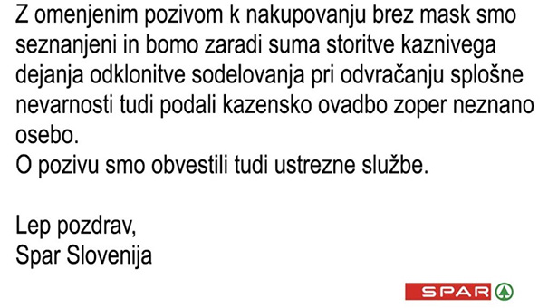 Vodstvo družbe Spar Slovenija bo kazensko ovadilo "neznane osebe", ki naj bi danes v Ljubljani, Mariboru in Celju poskušale po Sparovih trgovinah "naključno nakupovati" brez obveznih zaščitnih mask ...