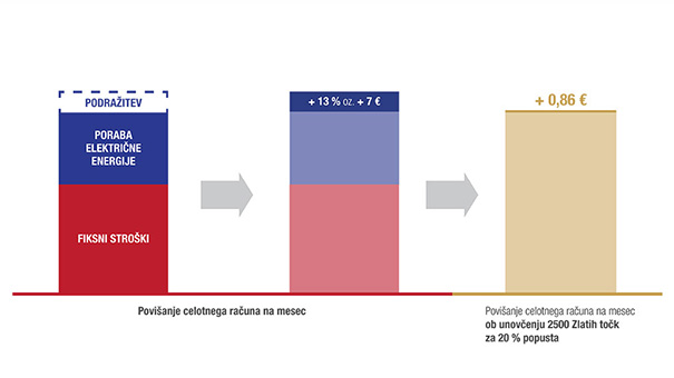 In kaj to pomeni za povprečnega gospodinjskega uporabnika? Z decembrom bo znesek na končnem računu Petrol Elektrike namesto za 30 odstotkov v resnici višji le za okoli 13 odstotkov. Če na leto porabite okoli 4.100 kWh električne energije to pomeni nekaj več kot 7 evrov na mesec. S popustom na Zlate točke pa lahko ta znesek še znižate.