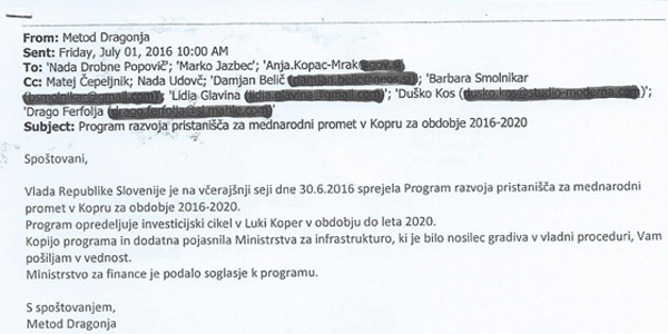 To je elektronsko sporočilo Metoda Dragonje, poslano vodstvu SDH.