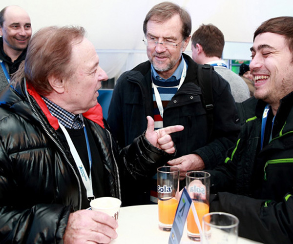 Nasmejani Matjaž Kovačič (na sliki skrajno levo) sredi VIP-šotora na letošnji Zlati lisici. V prvem planu pa Alfi Nipič, Lojze Peterle in Matija Stepišnik.