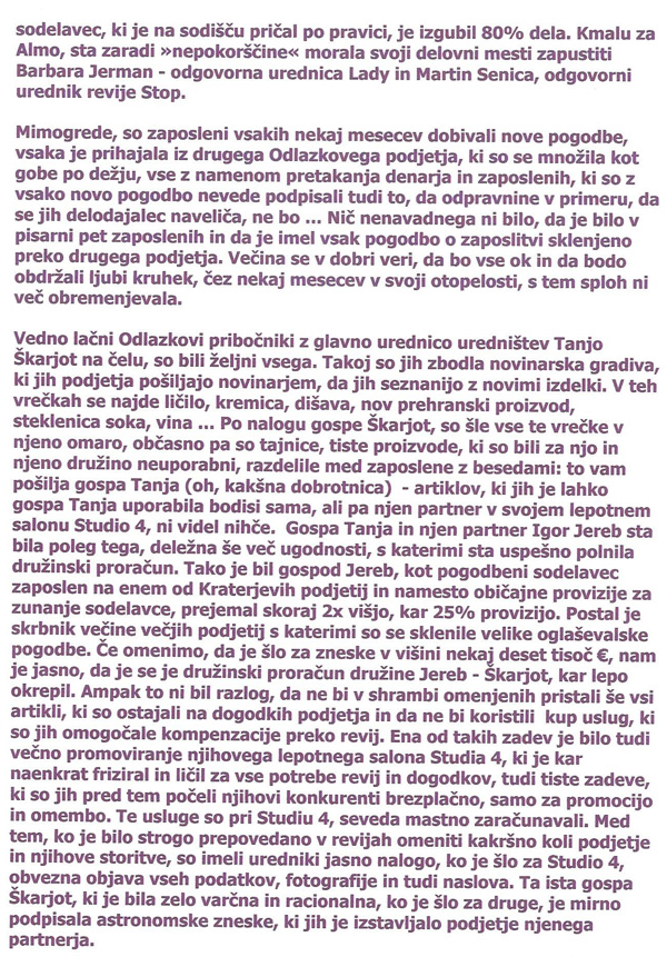 ... Zaposleni vsakih nekaj mesecev dobivajo nove pogodbe, ki prihajajo iz vedno drugih Odlazkovih podjetij, ta se pa množijo kot gobe po dežju. Vse z namenom pretakanja denarja in zaposlenih, ki so se z novimi pogodbami odpovedovali tudi odpravninam, če jih delodajalec vrže na cesto ...