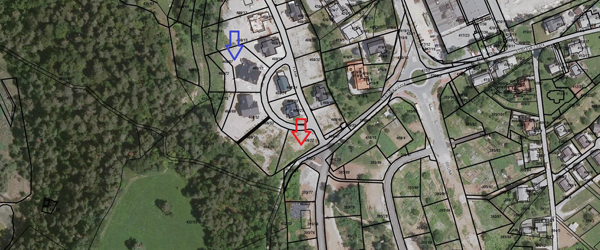 Pogled iz zraka: prejšnja (modra puščica) in bodoča Kordeževa vila (rdeča puščica) sta oddaljeni le nekaj sto metrov. Plana in Lesce - za vedno!