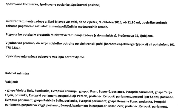 Vabilo ministrstva za zunanje zadeve na današnje srečanje oziroma pogovor s slovenskimi evropskimi poslanci in evropsko komisarko Violeto Bulc. Pogover je očitno tajen, saj novinarjev niso obveščali.