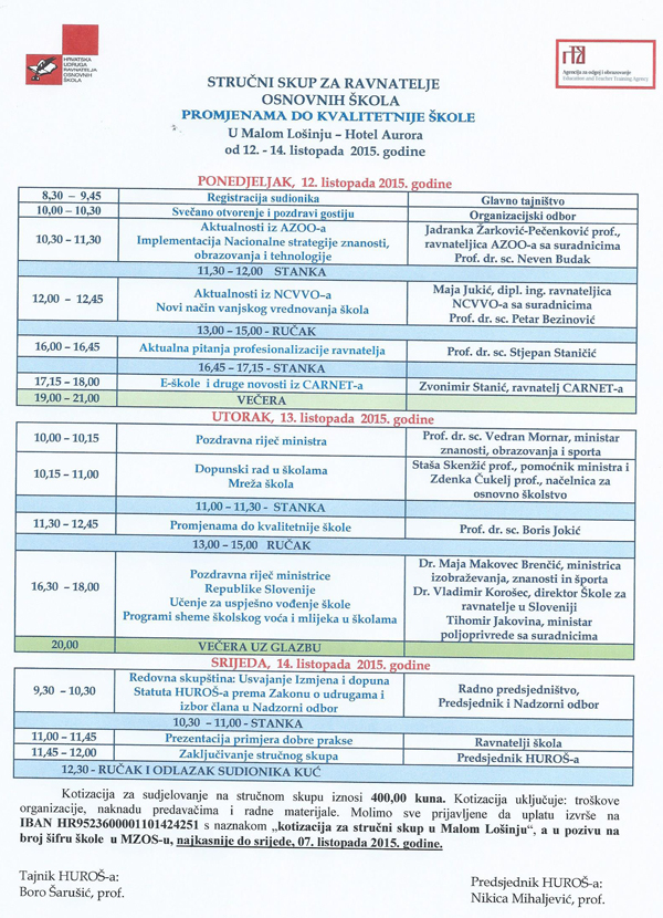 Program srečanja ravnateljev hrvaških osnovnih šol na Malem Lošinju. Slovenska ministrica Maja Makovec Brenčič nastopa v torek popoldne (za povečavo kliknite na sliko).
