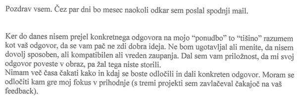 14. april. Sašo Papp je živčen, ker nima pozitivnega odgovora, zato začne groziti, da nima več časa čakati in da se mora odločiti, kam gre njegov fokus v prihodnje.