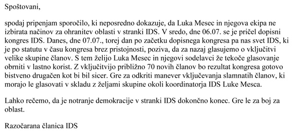Pismo razočarane članice IDS o začetku dopisnega kongresa ...