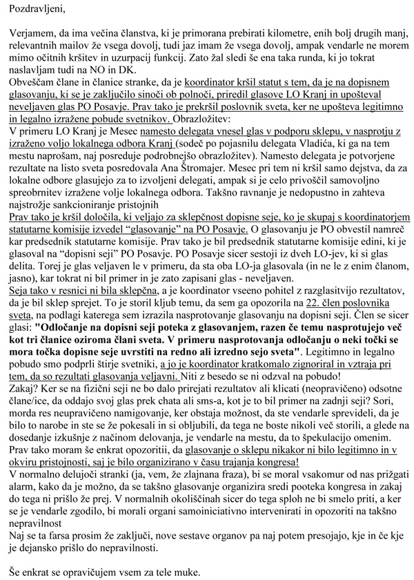 To pa je pismo iste razočarane članice IDS, ki podrobno opisuje manipulacije Luke Mesca v zadnjih dveh dneh, med dopisnim kongresom IDS (za povečavo kliknite na sliko).
