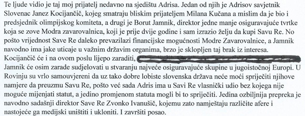 Faksimile dela anonimke iz Hrvaške, kjer med drugim piše, da naj bi na sedežu Adris Grupe v Rovinju opazili Janeza Kocijančiča in Boruta Jamnika.