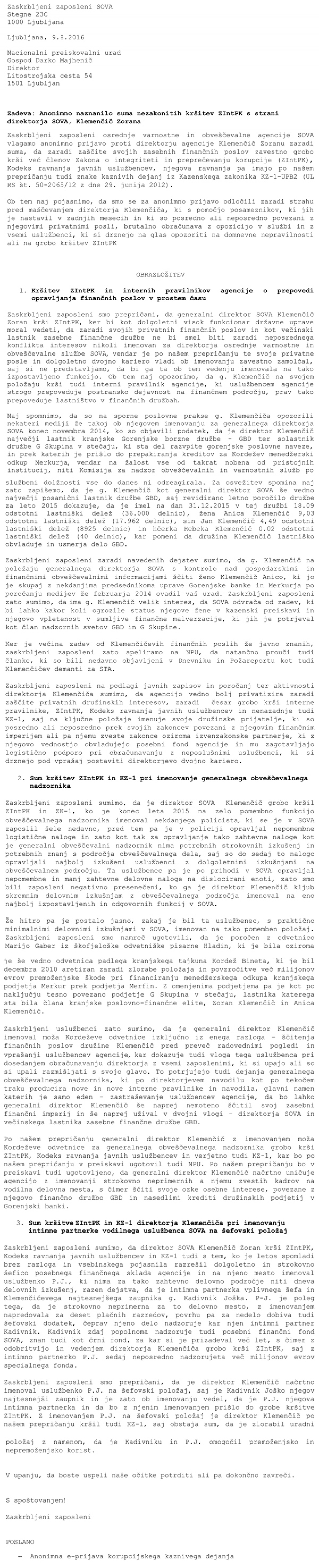 To je faksimile kazenske ovadbe zoper Zorana Klemenčiča, poslane na NPU ...