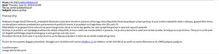 Faksimile kazenske prijave zoper Mira Cerarja, ki jo je na policijo poslal Zmago Jelinčič Plemeniti. Prvak SNC med drugih zahteva, naj policija razišče ozadje Cerarjevih groženj.