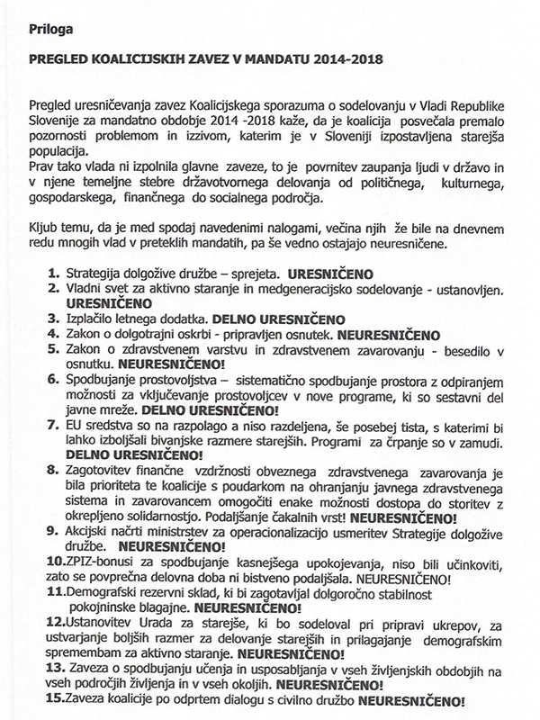 Memorandum Zvezde društev upokojencev Slovenije o zahtevah in pričakovanjih Zveze društev upokojencev Slovenije ter pregledu koalicijskih zavez med mandatom Cerarjeve vlade je za Karla Erjavca dobesedno porazen.