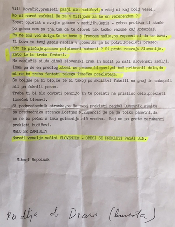 To je grozilno pismo, ki ga je prejel Vili Kovačič iz Koroške ...