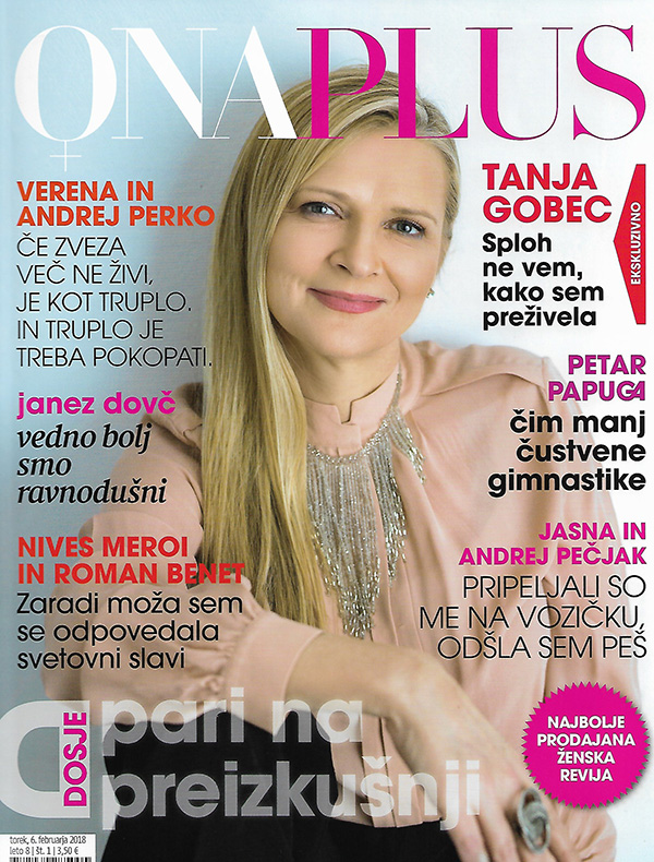 Tanja Gobec na naslovnici zadnje številke revije Ona Plus (časopisna hiša Delo), ki se reklamira kot najbolj prodajana slovenska ženska revija.