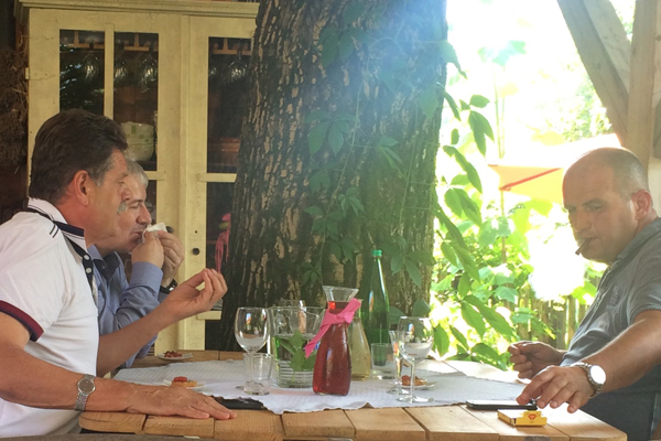 Biznis in pleasure. Andrej Godec, Damir Topolko in Blaž Miklavčič na kosilu ob Krki.
