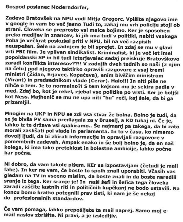 To je faksimile anonimnega pisma insajderja iz NPU, ki so ga po elekronski pošti prejeli nekateri poslanci v državnem zboru (za povečavo klikni na sliko).