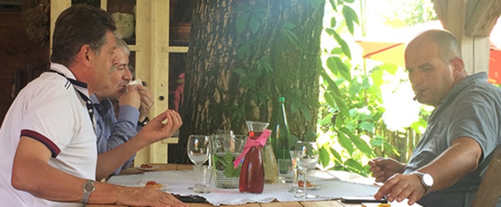 Na kosilu v gostilni Javornik, julija 2016: Andrej Godec (na sliki levo) nekaj razlaga, Damir Topolko si briše usta, Blaž Miklavčič pa uživa s cigaro.