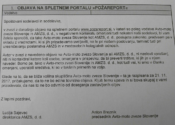 To je pismo, ki ga sta ga vsem zaposlenim na AMZS poslala in podpisala Lucija Živa Sajevec, direktorica AMZS, d. d., in Anton Breznik, predsednik AMZS.