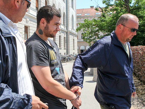 Stefan Cakič, uradno domnevni morilec Gašperja Tiča, pred stavbo ljubljanskega sodišča. Mediji do Cakića še vedno nimajo dostopa.