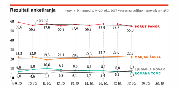 Borut Pahor še vedno proti zmagi v prvem krogu, Marjan Šarec ostaja na dobrih 20 odstotkih, Ljudmila Novak pa je po tej anketi prvič prehitela Romano Tomc (vir: Ninamedia za Dnevnik).