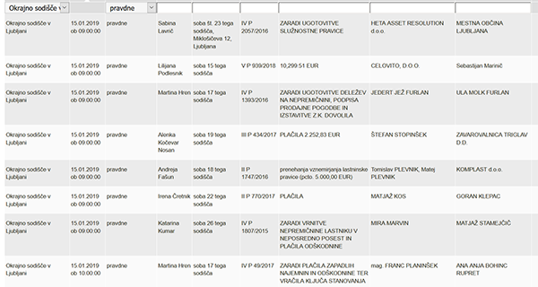 Današnji razpored glavnih obravnav v pravdnih zadevah. Vir: Okrajno sodišče v Ljubljani.