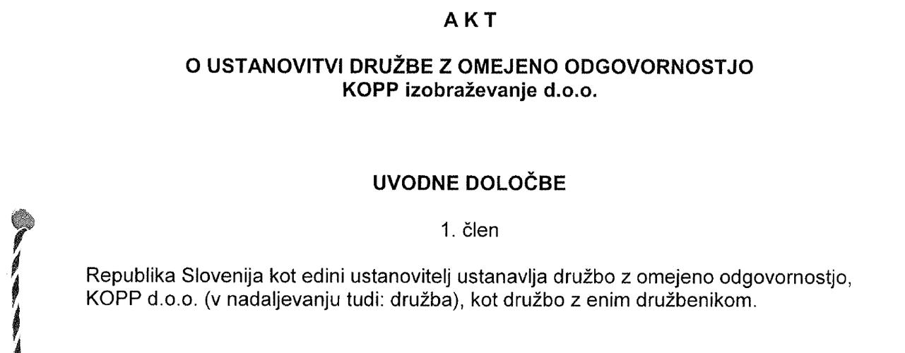 To je uradna dokumentacija, povezana z ustanovitvijo državnega podjetja za pomorsko pilotažo - KOPP izobraževanje, d. o. o.