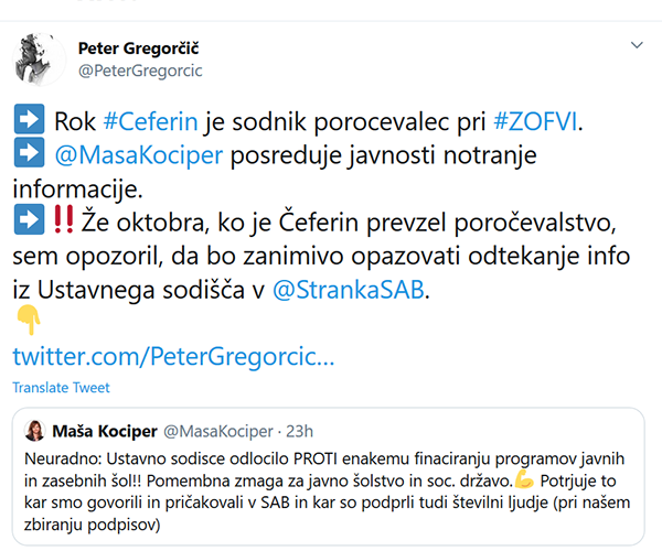 Peter Gregorčič, eden od pobudnikov ustavne presoje (so)financiranja javnih programov zasebnih osnovnih šol, sicer pa docent na ljubljanski Fakulteti za strojništvo, je že pred časom javno - prek twitterja - opozoril na možnost, da bi Rok Čeferin lahko nosil informacije iz ustavnega sodišča na sedež Stranke Alenke Bratušek ...