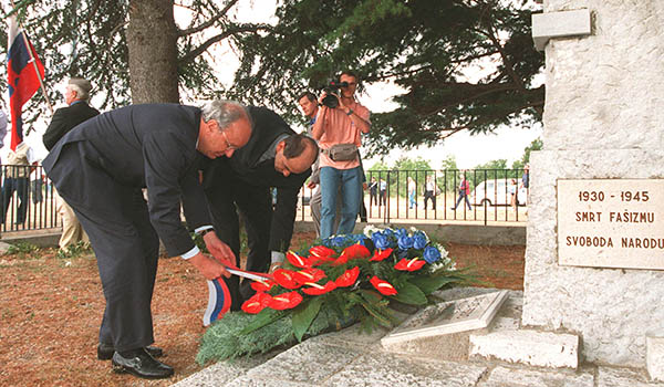Bilo je 6. septembra leta 2000: Tako sta danes že pokojni Andrej Bajuk in Janez Janša, takrat kot predsednik vlade in minister za obrambo, v imenu republike Slovenije položila venec na spomenik Bazoviškim oziroma Bazovskim žrtvam. (foto: Bobo)