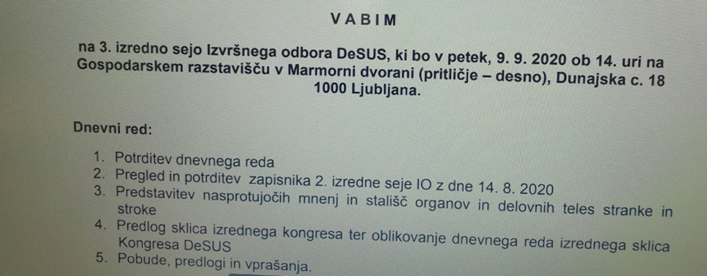 Vabilo na sejo izvršnega odbora stranke DeSUS, jutri ob 14.00