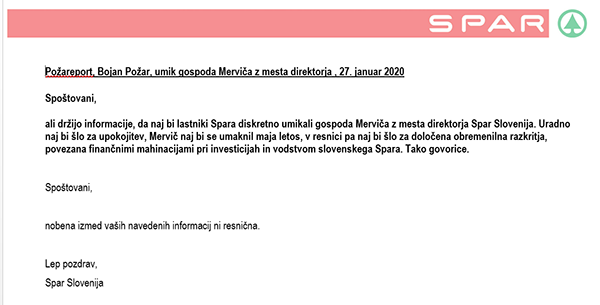 Elektronska komunikacija med Požareportom in Sparom 27. in 28. januarja letos
