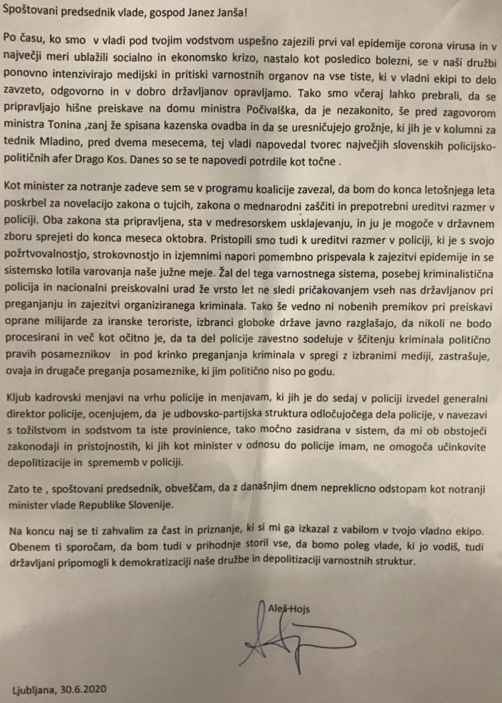 Faksimile odstopne izjave ministra Hojsa. (vir: Twitter)