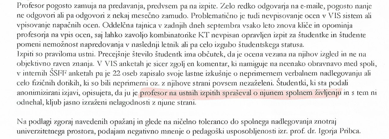 Kot izhaja iz pričujočega dokumenta, je profesor Pribac spolno nadlegovanje študentk prakticiral verbalno in celo z neprimernimi fizičnimi dotiki ...