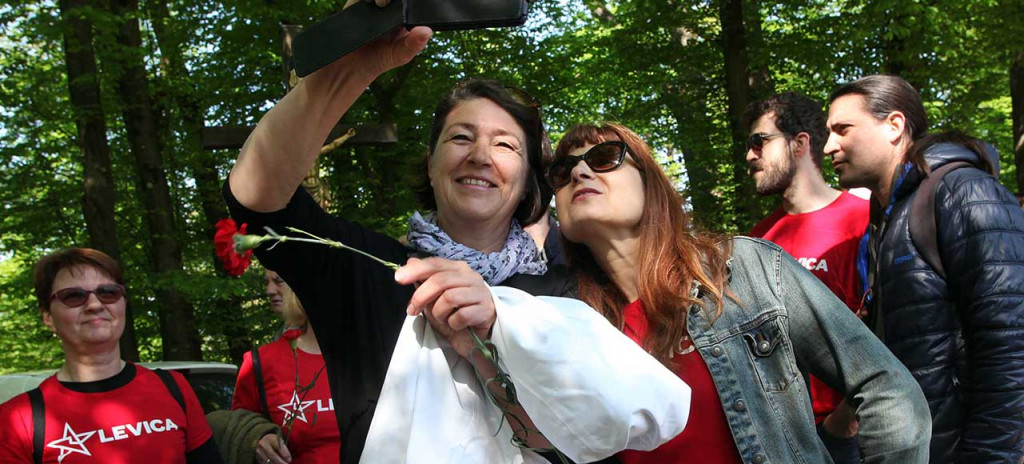 Bilo je 1. maja 2008 na ljubljanskem Rožniku: ko je Violeta Bulc, takrat še veselo evropska komisarka, delala selfije z Violeto Tomić in člani Levice. (foto: Bobo)