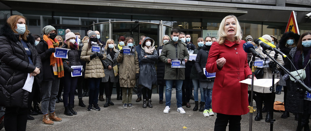 Danes pa taista Manica Janežič Ambrožič dela politično usmerjene novinarske prispevke za predvolilna televizijska soočenja na TVS ter pred stavbo RTV aktivistično kriči zoper tako imenovane politične pritiske na novinarje. (foto: Bobo)
