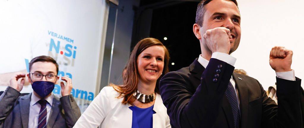 Matej Tonin, predsednik NSi (levo njegova žena Marjeta Tonin), med spremljanjem nedeljskih volilnih rezultatov v štabu Nove Slovenije (foto: Bobo)