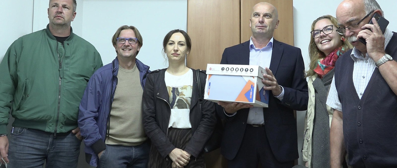 Janez Kerin z volilno škatlo v roki, medtem ko Peter Žigante (desno) telefonira. (vir: Facebook)