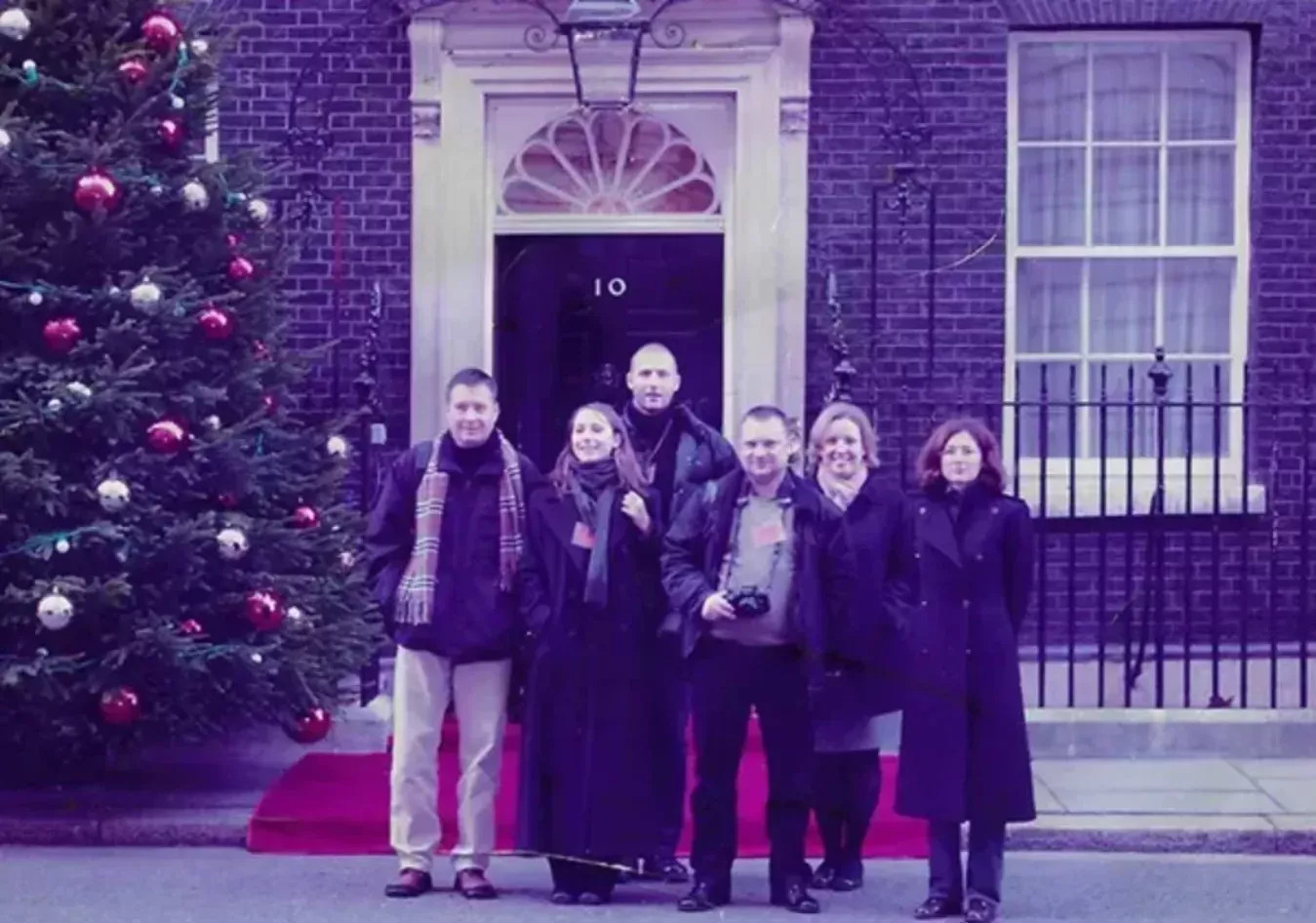 Zgodovina fotografija: moja malenkost (na levi) pred vhodom v Downing Street 10, kjer je sedež britanskega šefa vlade, skupaj z drugimi slovenskimi novinarji.