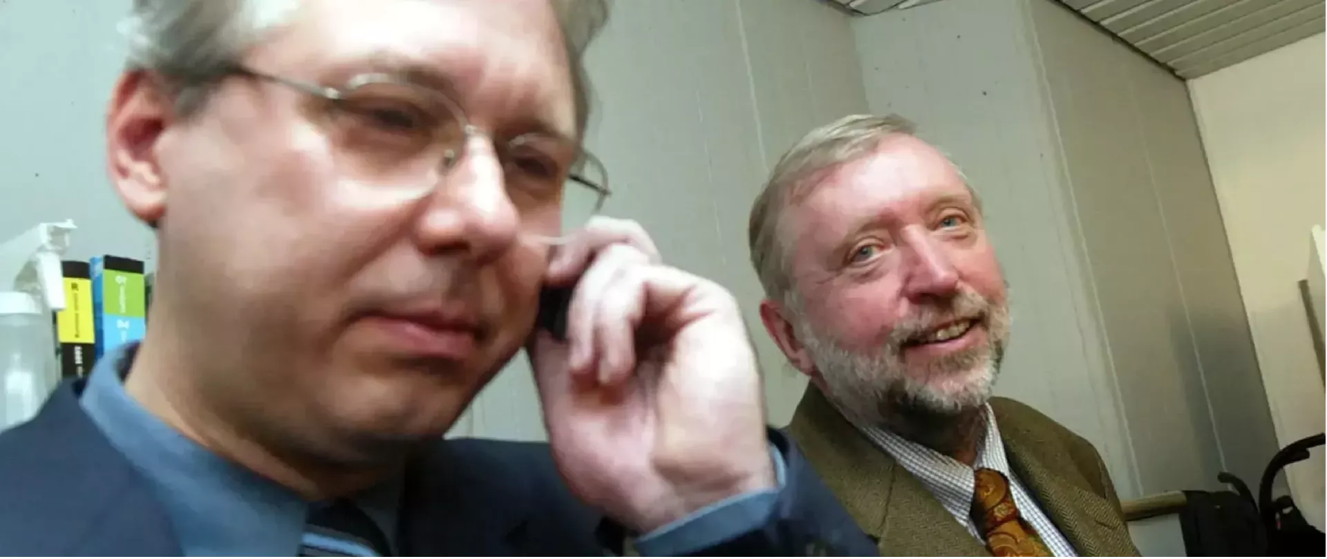 Peter Jamnikar in Dimitrij Rupel, decembra 2002, po zmagi Janeza Drnovška na predsedniških volitvah, v volilnem štabu LDS (foto: Bobo)