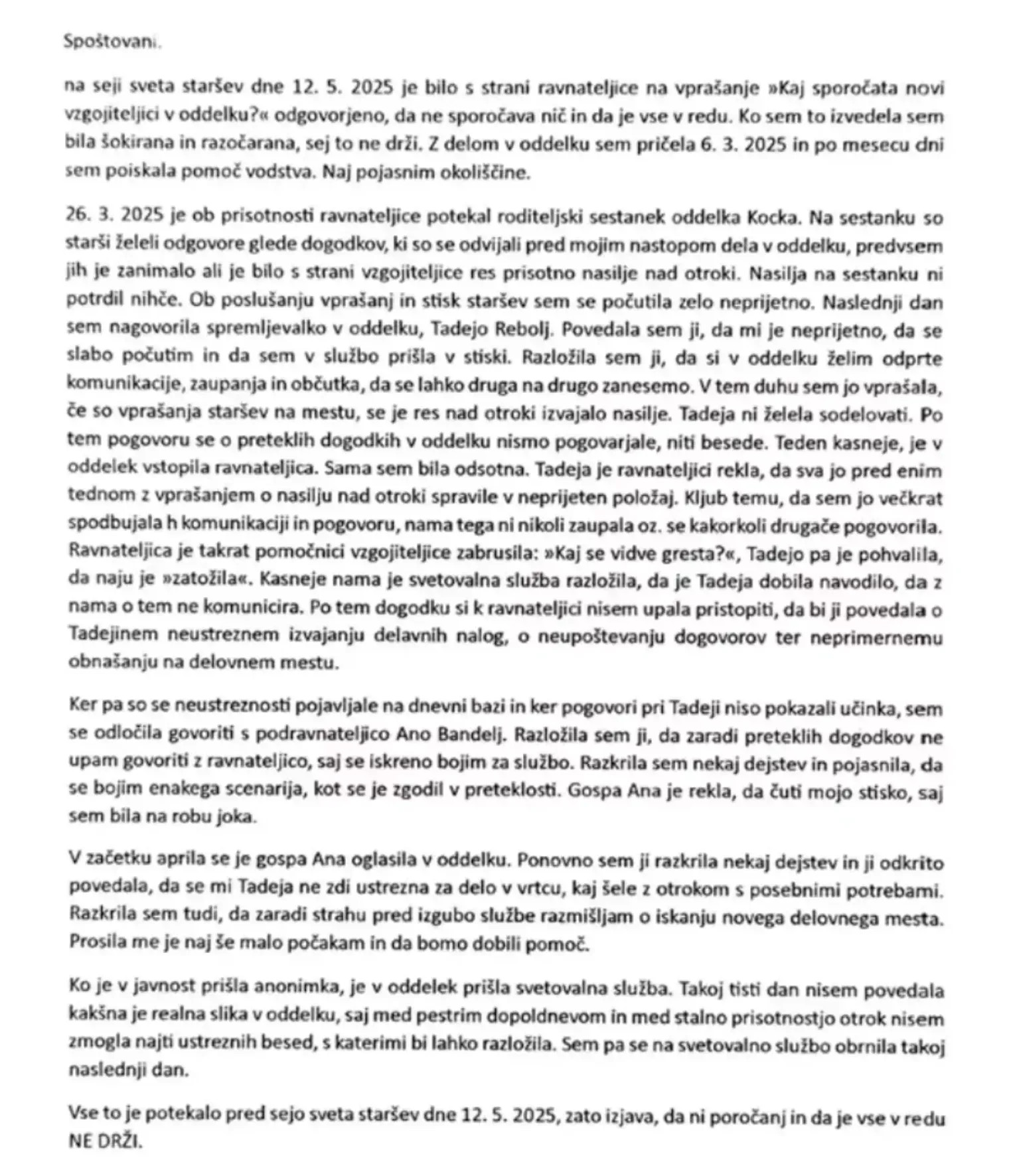 Pismo vzgojiteljice, ki ravnateljico postavlja na laž (ime in priimek sta znana avtorju članka).