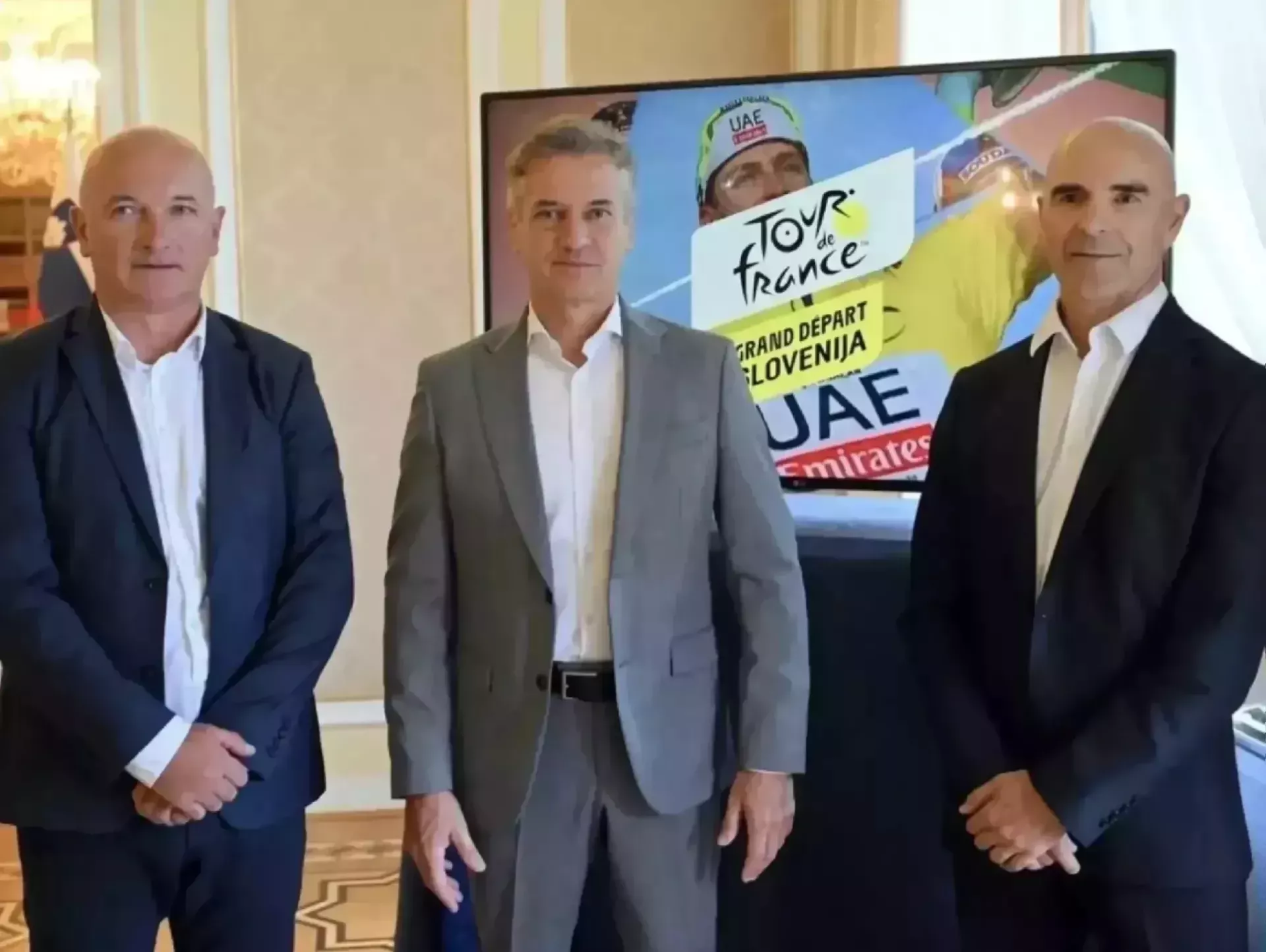 Predsednik vlade Golob na predstavitivi vladne pobude za slovenski start Dirke po Franciji oziroma Tour de France, leta 2029. (minuli petek, vir: X)
