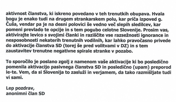 Se strinjam, da je neke vrste provokacija. V bistvu hoče pa relativizirati prejšnji članek požarja. V prejšnjem je zadel s kladvom po betici, in zdaj tisti štirje junaki se hočejo malo skriti v ozadje. Je pa jasno, da poleg tistih štirih obstajajo še drugi,tudi Han in še ene par mandelcev, ki se morajo skupaj usesti. Sam ta SD je že tko skozlana grupacija, da je res čudno, da je ni že vrag vzel. Znotri stranke imajo ene par struj, ki se med sabo srdito bojujejo, to sicer nekako dokaj dobro skrivajo. Navznoter je stranka prazna, brez vizije, brez narodnih interesov. Gre sam še za plenjenje, postavljanje svojih na položaje. Kar jim gre mimogrede zelo dobro. Tiste par procentov podpore v volilni bazi jim daje 50% udeležbo pri plenjenju podjetij v državni lasti. Najhujša je tista struja, ki se je poročila s svojim naravnim sovražnikom, seveda SDS. Zadetek požarja v polno je, da je novega člana v SDH skadrirala četvorica, verjetno Levanič in Miha Butara, ki sta povezovalna člena s SDS, nekateri pa so tudi na plačilni listi, ki jo plačujejo direktorji SDS. Mandeljci so, ni kaj, kapo dol. Voditi državo s 5% volilne podpore je velik uspeh.