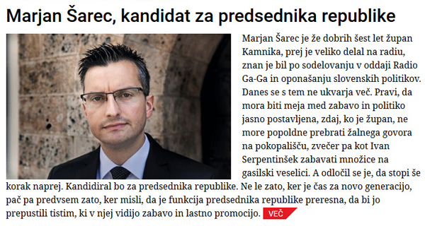 Motijo se tisti, ki v Šarcu še vedno vidijo komika. On se danes tega celo sramuje, mimo kamere bi dejal, da je uganjal norčije, ko je bil mlad in neumen. Klovn bo tokrat na nasprotni strani...Kameleonska pretvorba iz šaljivca v uspešnega in strogega župana, pa se pri Šarcu odraža tudi nasploh, kar mene osebno zelo moti. Nekdo, ki hodi v cerkev, tam tudi kot suport duhovniku aktivno sodeluje, pač ne more, niti v sanjah, niti pijan, družiti se z ljudmi sumljivega slovesa, da ne zapišem tistimi na drugi strani zakona. Mislim na njegovo članstvo v Požitivni Srbiji in na to, da za nim stoji Kučan...Glede na to, da so Pahorja na tistem dobrodelnem maratonu letos ujeli prav pred Šarčevo hišo je morda nekaj simbolike in hkrati čas, da ga ta tudi zamenja. Tu ne gre za tiste vrste prevaro z novimi obrazi kot pri cmerarju, a vseeno, predsednik in kandidat sta si precej podobna. Rada nastopata, sta uglajena in urejena, tudi nekaj narcisoidnosti je v obeh. Za državo in državljane se ne bo nič spremenilo. Na bolje, mislim. Imamo pa vsi, levi in desni, Pahorjevih norčij dovolj.