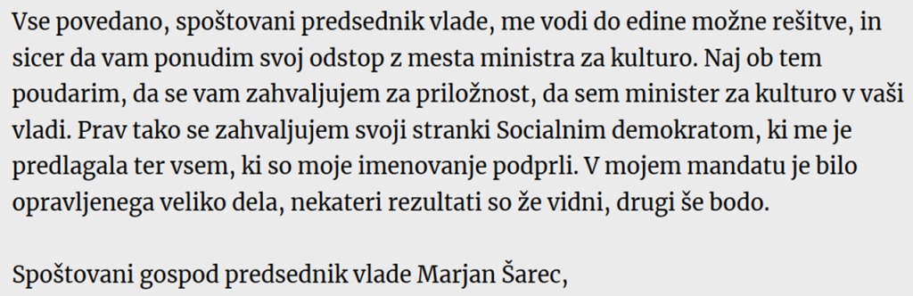 Stopetdeset zaposlenih na ministrstvu za kulturo. Morda še nekaj deset več. Za srednje veliko podjetje jih je. Kaj sploh počnejo ? Kot velika družina v garsonjeri, se zaletavajo eden v drugega in prepirajo. Ko mora nekdo za trenutek odložiti nedelo in kaj postoriti, gre za mobing. Vse breme je nase prevzemal tisti, ki je bil zadnji v vrsti, najslabše plačan. Zanje ni bil kulturnik. Vsi so ga izkoriščali, ne le minister. Kako se je končalo, vemo...Žepna državica kot smo, ne bi smeli trpeti več kot tretjino tega kadra na ministrstvu, ki sploh ni nujno potrebno. Zagotovo bi tudi ti zmogli pripraviti proslavo ob kulturnem prazniku. ..Vlada in tisti nad vlado, zdaj rešujejo Škoberneta, ne Prešička. On je le kolateralna škoda. Če ostane minister, ostane tudi sekretar. Ni Šarec tisti, ki odloča. Daleč od tega. Zadnjo imajo tisti, ki lahko zamenjajo vse tri. Šarec edini iz igre ne more oditi prostovoljno. Niti ni bojazni za kaj takega.