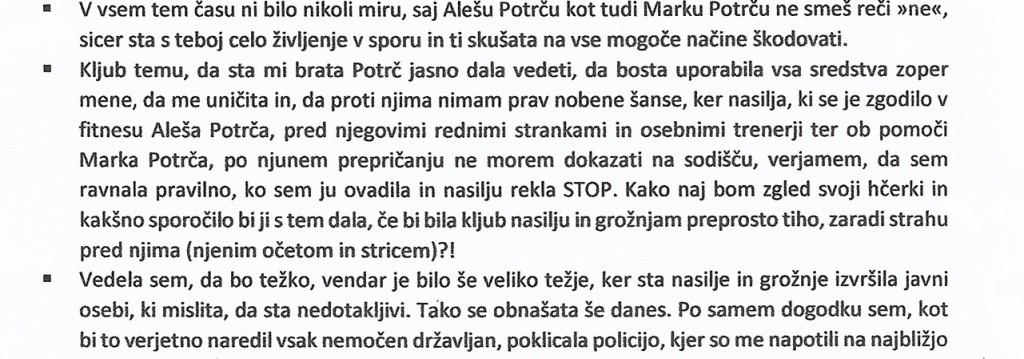 Tipičen primer kako nizko smo padli SLOVENCI. Dva nabildana butlja medijsko izpostavljena s kurjimi možgamni in njunima partnericama si mislijo,da jim je vse dovoljeno.Je res odločilna samo še zunanja fasada človeka in njegov lažni status igranja omikane jare gospode? Kaj Potrčema pomaga vsa ta lažna fasada,če sta v sebi popolnoma gnila osebka,ki gradita svoj lažni status v slovenski družbi.Popolnoma verjamem gospe Dubrovnik,ki je zadevo zapisala na najbolj realen način in ni izpostavila niti ene neresnične stvari. V njenem pismu je samo realnost brez nepotrebnega napihovanja zadev.Že to pove vse,zato ni potrebno biti psiholog,da ugotoviš,da je bila napadena in ogrožena s strani teh dveh kretenov.Policija je v njenem primeru delovala neprofesionalno,kot v večini primerov,če so v zadeve vpleteni medijsko ali politično poznani osebki.Koga se policija boji? Sama sebe,ali ni njena dolžnodst podati prijavo in obravnavati vsak napad na osebno človekovo integriteto? Izgubljena država in izgubljena pravica, resnica in to je danes Slovenija.