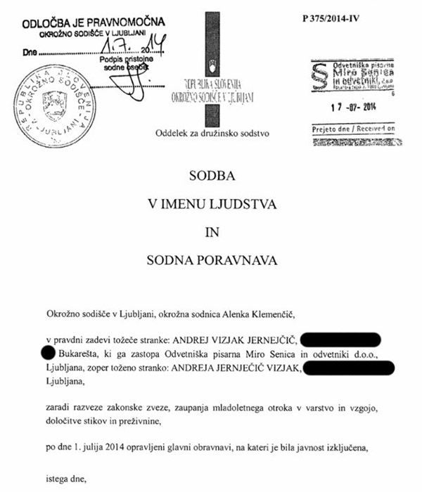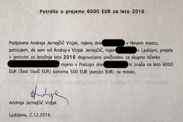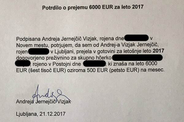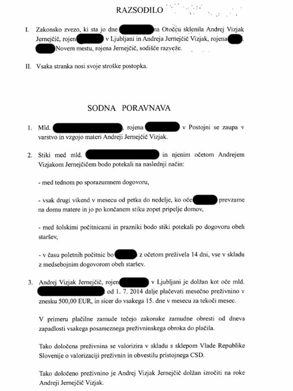 - Preživnino za hčerko v višini 500 evrov mesečno (brez valorizacije) naj bi Andrej Vizjak plačeval na podlagi sodbe in sodne poravnave pred ljubljanskim okrožnim sodiščem, iz julija 2014: