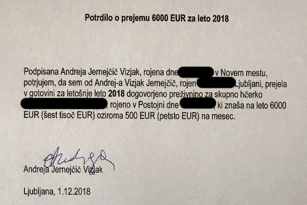 - Pisna potrdila, ki naj bi jih Vizjak v zadnjih dneh pošiljal medijem prek najete svetovalke Milene Kalaacunn (več o njej v nadaljevanju tega članka), pa naj bi bila ponarejena. Tako vsaj zatrjuje Andreja Jernejčič, dokaz za njene besede pa naj bi bila tudi sama potrdila, z nenavadnimi fonti, zastarelimi že več let. Res je skrajno nenavadno, da bi se Vizjak še decembra 2018, torej pet let po ločitvi, podpisoval kot "Jernejčič" ("Andrej Jernejčič Vizjak"?!, saj je on namreč samo Andrej Vizjak!) in enako velja za Andrejo Jernejčič. Potrdila naj bi "zložil" ali ponaredil Vizjak, in sicer na podlagi bianco podpisanih papirjev, ki naj bi jih Andreja Jernejčič podpisovala ob ločitvi. Po naših informacijah naj bi Jernejčičeva zoper Vizjaka pred dvema mesecema zato vložila tudi tožbo - zaradi neplačevanja preživnine.
