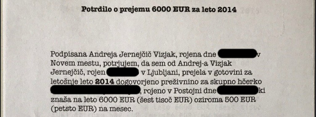 Dokumenti in izjave, ki jih objavljamo v nadaljevanju, namreč utemeljeno kažejo na sum, da je Andrej Vizjak med drugim celo ponaredil tako imenovana potrdila o plačilu preživnine za hčerko, ki jo ima iz drugega zakona, s svojo bivšo soprogo Andrejo Jernejčič, sicer znano slovensko svetovalko za odnose z javnostmi.