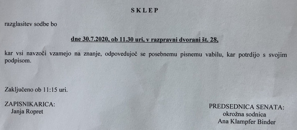 Kako bo razsodila okrožna sodnica Ana Klampfer Binder (ki je glavno obravnavo sicer vodila korektno, žal pa obrambi in avtorju teh vrstic ni dopustila izvedbe posameznih pomembnih dokazov in vsaj enega zaslišanja priče), bo znano danes ob 11. uri in 30 minut, ko je na ljubljanskem sodišču v dvorani številka 28 predvidena razglasitev sodbe.