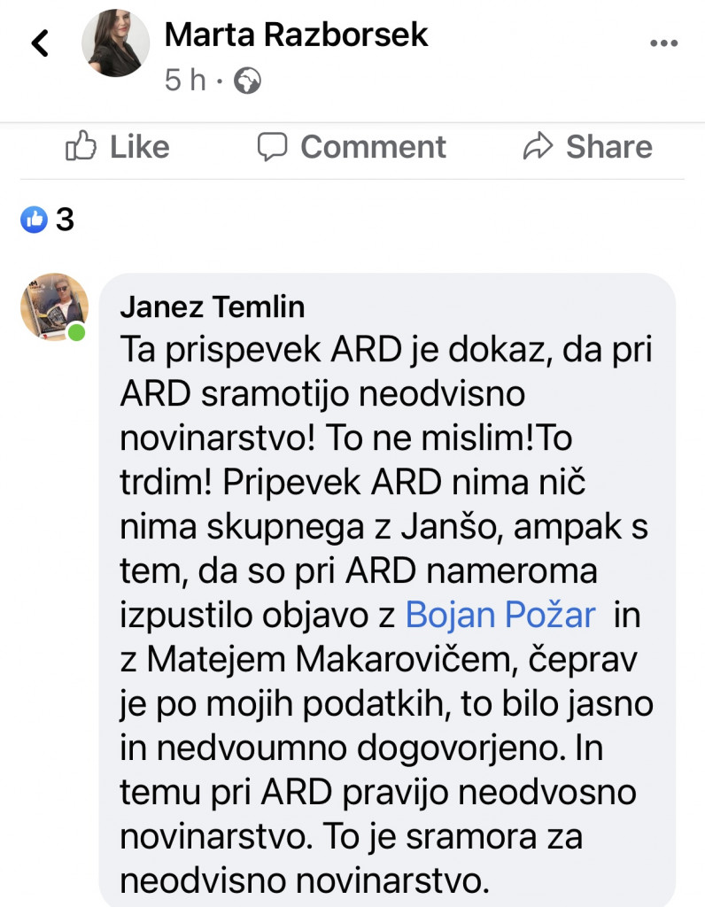 Iz ARD so sem očitno prišli z vnaprej določeno (medijsko-politično) agendo, da morajo potrditi navedbe političnih in medijskih nasprotnikov Janeza Janše, ki se iz Slovenije uvažajo v Evropo in potem nazaj, češ, poglejte, kaj poročajo tudi uveljavljeni mediji, z namenom političnega boja proti Janši. Moji odgovori, komentarji, povedana in preverljiva dejstva pa so jim seveda očitno štrleli ven iz tega konteksta, iz te njihove vnaprej pripravljene pristranske agende.
