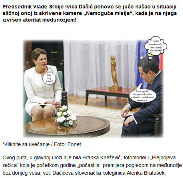 Bratuškova na diplomatskem parketu, je kot slon v trgovini s porcelanom. Tudi meni deluje skrajno neookusno in kmetavzarsko, to njeno nastavljanje v preozkih krilih, ki pa so dosegla svoj namen, ko je prihajala do magisterija. Mentor je verjetno bolj gledal v mednožje, kot v magistrsko nalogo.